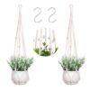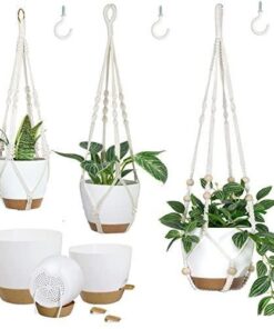 Beyaz renkteki plastik saksılar ve pamuk ipten örülmüş makrome askılar birbirleriyle uyumlu bir görünüm oluşturur.