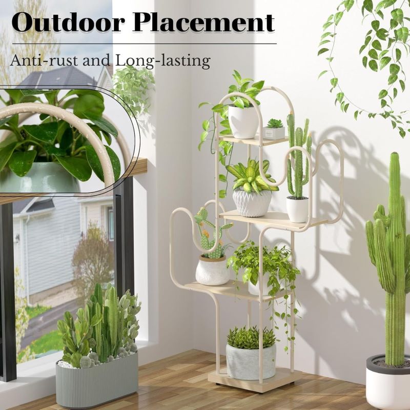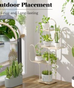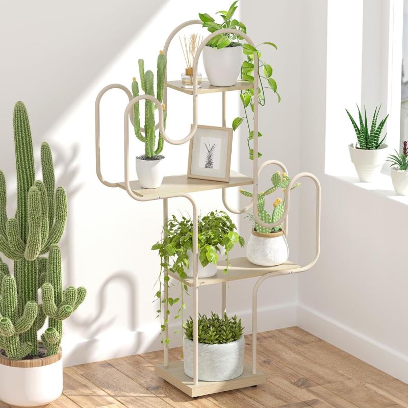 Rafların arasındaki boşluklar, sarkan bitkilerin doğal akışına olanak tanır. Krem rengi tonu sayesinde her türlü dekorasyon stiline kolayca uyum sağlar. Bu çiçeklik, bitkilerinizi sergilemek için şık ve fonksiyonel bir çözümdür.