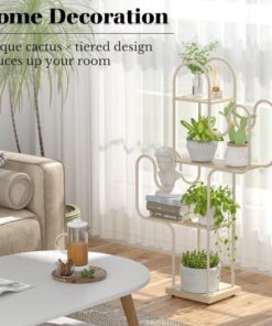 Bu benzersiz çiçeklik, kaktüs siluetini modern bir tasarımla birleştiren dekoratif bir üründür. 101 cm yüksekliğinde ve 61 cm genişliğinde olan ürün, krem rengi metal çerçeve ve ahşap raflardan oluşur.