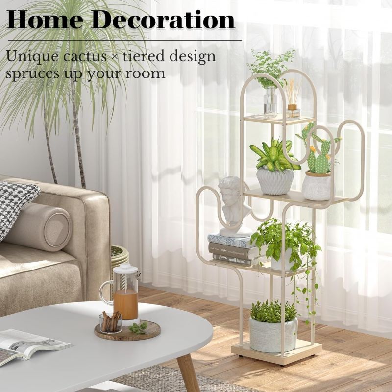 Dört katlı tasarımı ile farklı boyutlardaki saksıları ve dekoratif öğeleri sergilemek için geniş alan sunar. Kaktüs formundaki metal detaylar, ürüne özgün bir karakter katar. Rafların üzerine hem bitki saksıları hem de çerçeve gibi dekoratif aksesuarlar yerleştirilebilir.