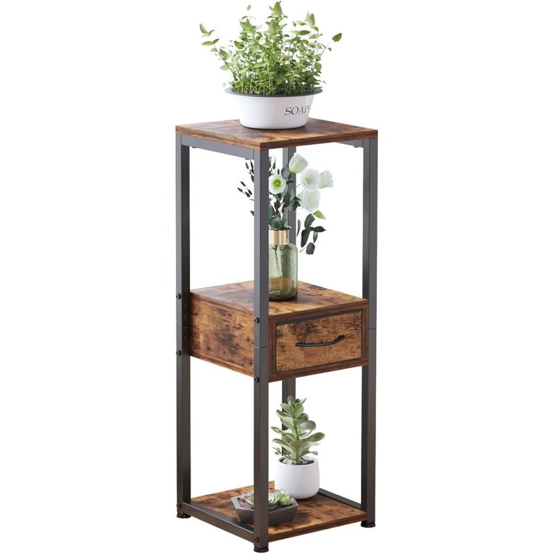 Üç katlı tasarımı sayesinde farklı boyutlardaki saksılarınızı düzenli şekilde sergileyebilirsiniz. Orta katta bulunan çekmece, bahçe aletleri ve diğer küçük eşyalarınızı saklamanıza olanak tanır. Metal iskelet ve ahşap rafların uyumu, rustik ve modern tarzı bir araya getirir.