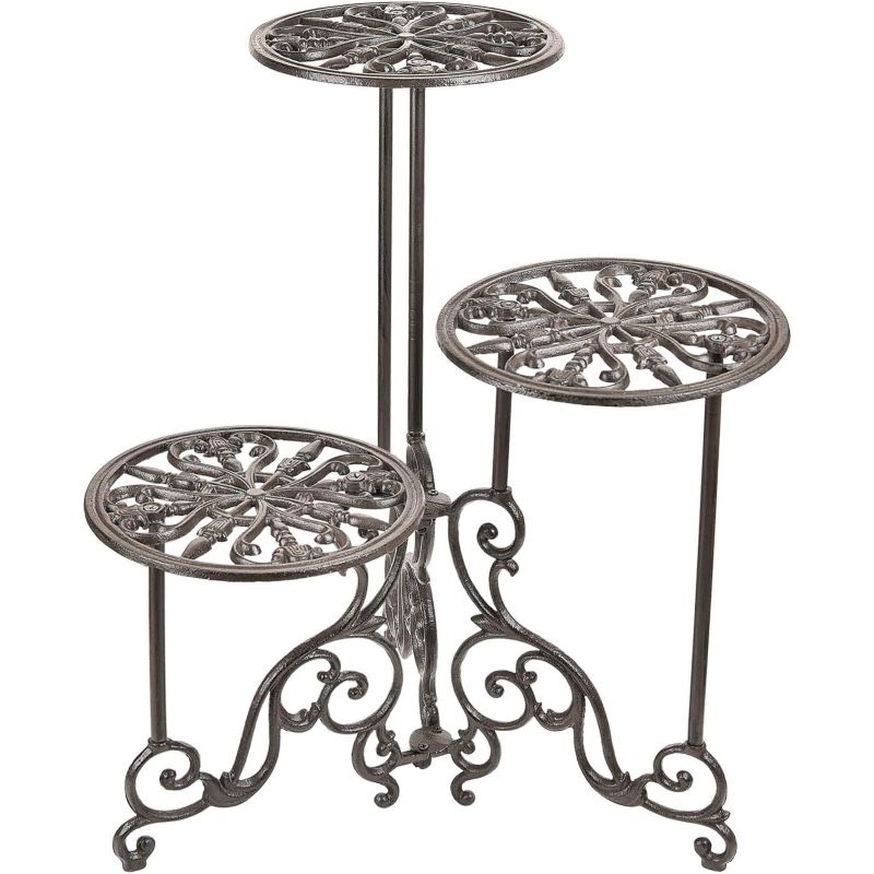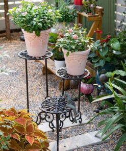 Bu zarif döküm çiçeklik, klasik tasarımı ve işlevselliği bir araya getiren özel bir üründür. 61 cm yüksekliğinde ve 55 cm genişliğinde olan ürün, farklı seviyelerde konumlandırılmış üç dairesel raftan oluşur. Her bir raf, detaylı işlenmiş çiçek motifleriyle süslenmiştir.