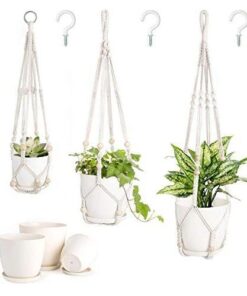 Bitkilerinizi modern ve şık bir görünümle evinizde sergilemek için tasarlanan bu makrome saksılık seti, üç farklı boyutta asılabilir saksıdan oluşur. Pamuk ip ve kaliteli plastik malzemeden üretilen set, hem iç hem dış mekanlarda kullanılabilir.