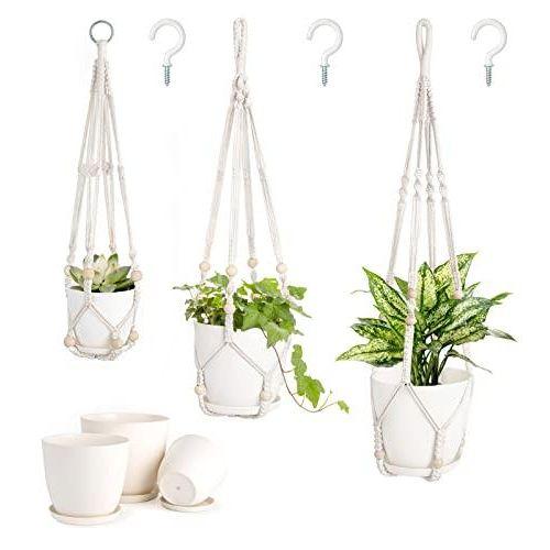 Set içeriğinde 89 cm, 74 cm ve 58 cm uzunluğunda üç adet makrome askı, 16.5 cm, 14 cm ve 11.5 cm çapında üç adet plastik saksı, üç adet kanca ve kendi kendine sulama için üç adet delikli altlık bulunur.